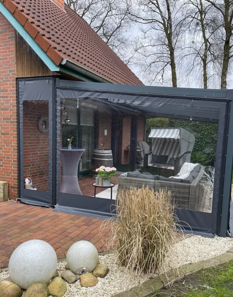 Unsere Terrassenverkleidungen bieten zuverlässigen Schutz bei jeder Witterung. Maßgeschneidert für Gastronomie, Hotellerie und Gewerbe.